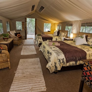 Luxury ensuite tent accommodations with all amenities including air conditioning